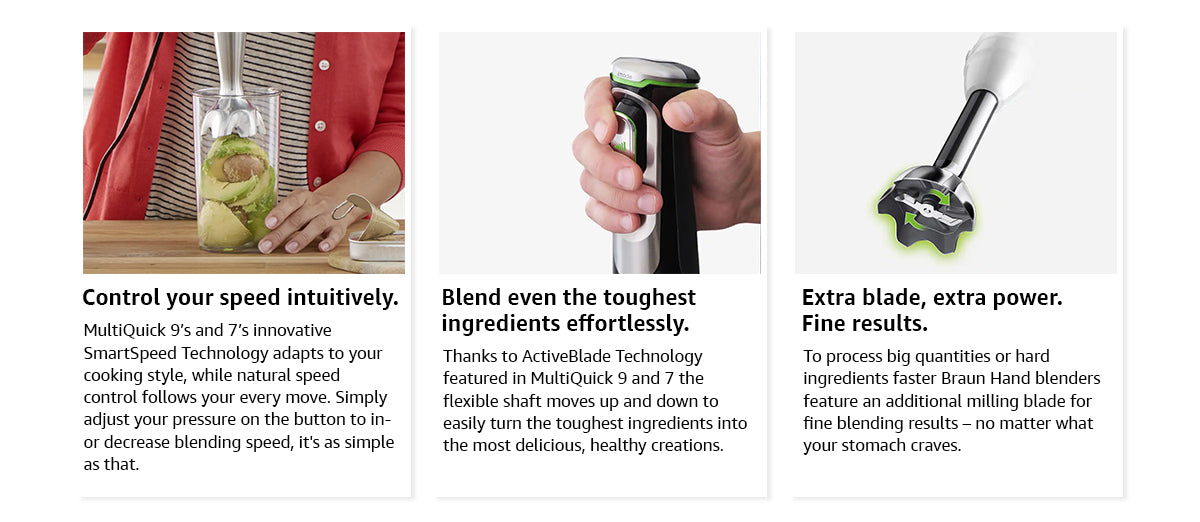Every Braun Hand blender is equipped with SplashControl Technology to enjoy perfect results with no mess, as it prevents splashing while blending.