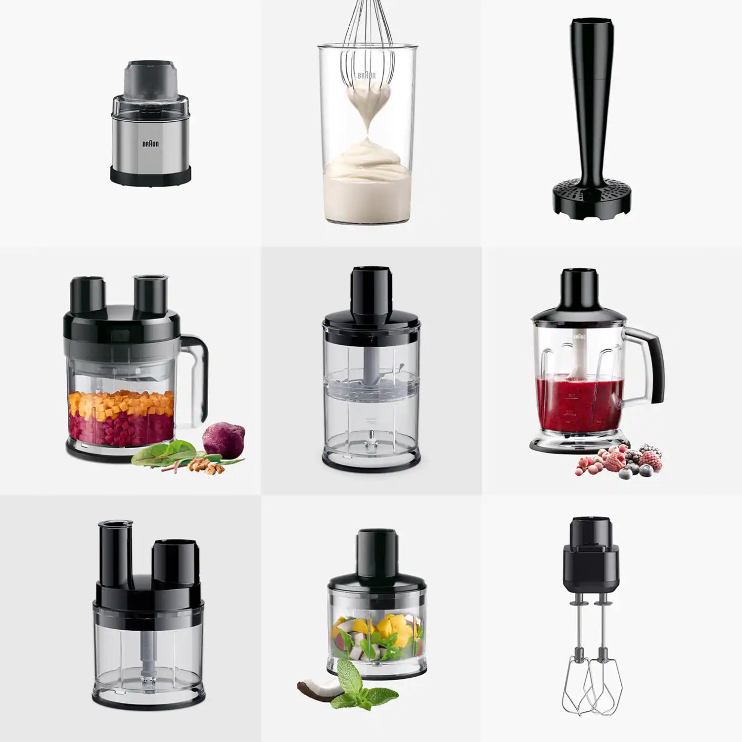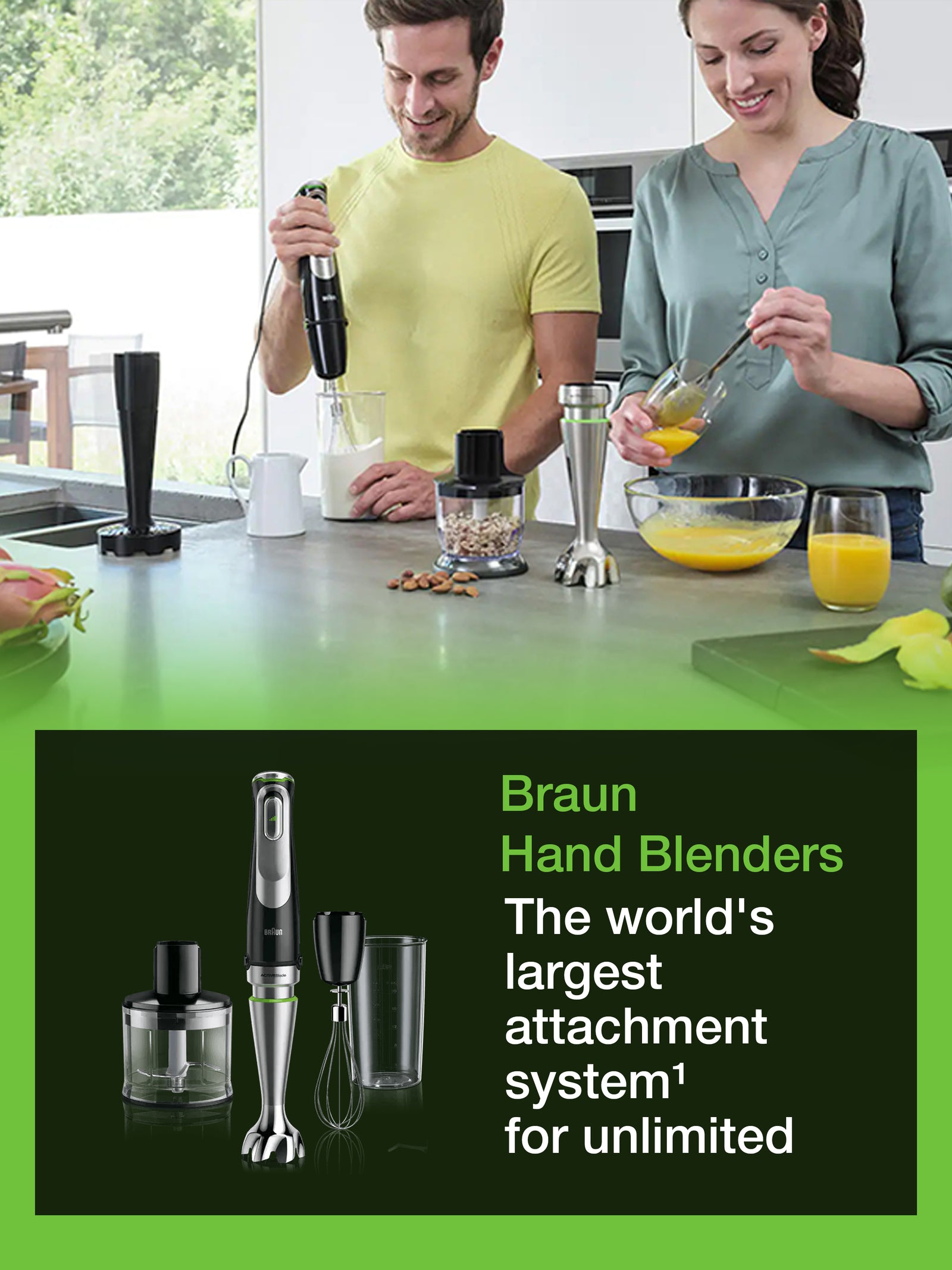 Are you tired of using multiple tools to create one recipe? Braun‘s MultiQuick series with EasyClick+ attachments are here to make food preparation easier, with an attachment for nearly every need in food preparation. Blending healthy smoothies or soups, chopping nuts or hard cheeses, prepare creamy and nutritious Hummus, create vegetable or fruit purées suitable for baby nutrition or even prepare your homemade spice blends. And it does not end here! Have a look at all attachments to find out how preparing complex recipes can be a breeze.