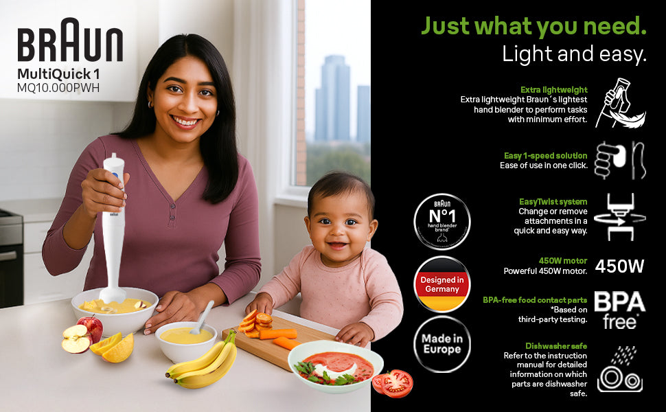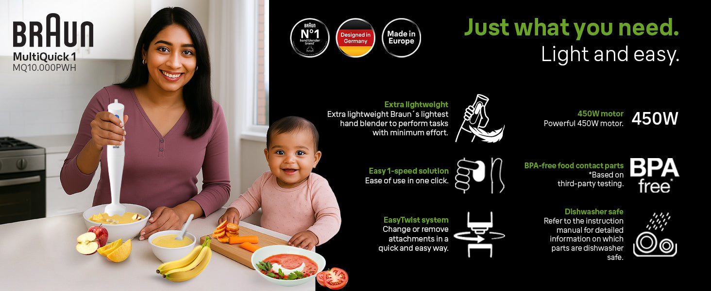 The new simplicity of lightness. Braun’s lightest hand blender helps you get the job done with ease. Create simple recipes, smoothies and sauces with minimum effort.