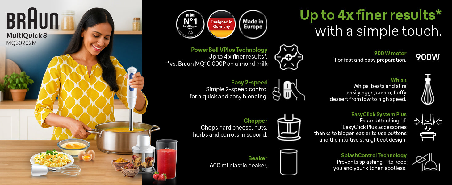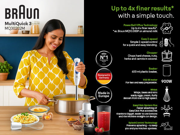 Up to 4x finer results*. An extra milling blade and 6 inner ribs create more interaction between food and the blades. *Vs. Braun MQ10.000P on almond milk.