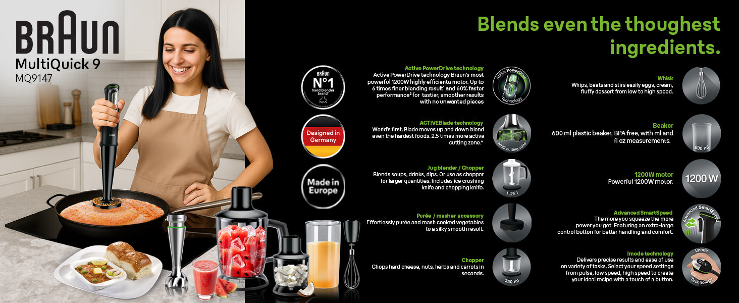 Braun’s flagship MultiQuick 9 just got better. Introducing new, cutting-edge features like Active PowerDrive Technology that results in up to 60 % faster performance* thanks to its 1200-watt motor and ActiveBlade Technology, which moves up and down to easily turn the toughest ingredients into the most delicious creations. And with the new imode Technology you can choose between 3 speed modes: pulse, low and high speed to customise your blending power into practical speed ranges for different tasks.